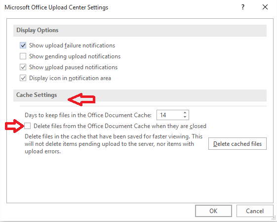 • Below Cache, settings select Delete files from Office document cache when they are closed