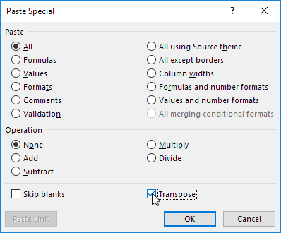 - Press Ctrl+Alt+V to access the same Paste Special option >> Check the Transpose option.